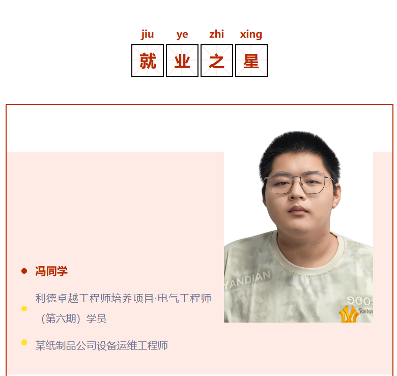 在某纸制品公司的设备前,冯同学一身工装,正专注地站在操作面板前。他的目光平稳地扫过图纸上的每一条线,又落回闪烁的数据屏上,指尖轻点按钮,动作干净而熟练。刚刚从利德卓越工程师培养项目·电气工程师(第六期)结业不过两个月,他已凭借出色的表现提前转正,月薪8000元,成为车间里备受认可的新晋骨干——设备运维工程师,这是他职业生涯起步的见证
